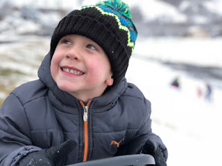 Mike and Kate invited us to their cabin up Spanish Fork Canyon. Kaitlyn’s parents purchased a home and totally fixed up it. This way the family would have a place to stay when they were all gathered for Christmas and they could live there for part of the year. Her siblings like to come to Utah around Christmas for skiing, and Utah is much closer to California than Florida (where their parents usually live). We met up at Cafe Rio beforehand and then arrived to this wonderful home that felt like a legitimate log cabin. We explored the cabin when we arrived and were so excited. The boys were thrilled too. They played with Rudy (one of their favorite things), we played ping pong, drank hot chocolate and ate treats, watched the Olympics, and chatted. We all had a great time. In the morning we had a pancake breakfast, went sledding in the snow, ate DiGorno Pizza for lunch, drank more hot chocolate, and played CodeNames. The boys also enjoyed the cozy time by the fire, playing on the iPads to their heart's content while the adults lounged and chatted.