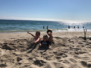 On Monday, we left early for the beach near Oceanside Pier. Jason did some surfing to the left and the boys played in the water to the right. It was the perfect beach for them! They loved it! It was shallow water for a good distance, so it was safe to play in. They built sandcastles and played in the waves. Charlie was especially brave and loved jumping over the small waves. He would get so into it that he would eventually coast down the beach a little ways so we would have to keep a close eye on him so he didn't get lost. We brought our new half tent umbrella and that worked perfectly to give us some shade and to keep Jonah cool while he napped in his car seat. He did awesome sleeping most of the time that we were at the beach. We were at the beach from about 9:30am until 3:00pm. We also did some body boarding. Charlie loved it, but Colson didn’t love it as much. The water was super warm, warmer than Jason ever remembered California beaches being. Basically Hawaii-warm. Once you got swimming in it you weren’t cold at all. We brought lots of snacks and a cooler.